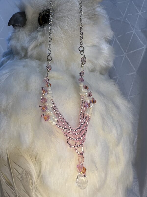 Hand-sewn pink crystals & seed beads with clear drop crystals.