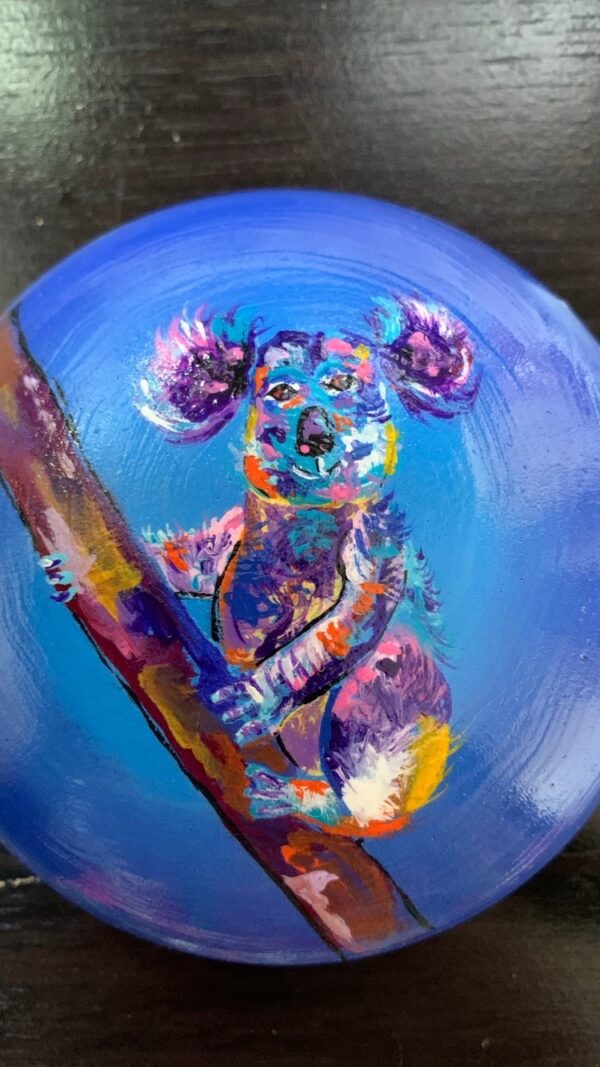 Hand-painted koala, acrylic on hand-made rock, 4″ x 1.5″.