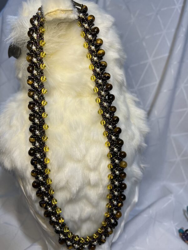 Large cats eye stones surrounded by purple seed beads, white pearls & citrine.