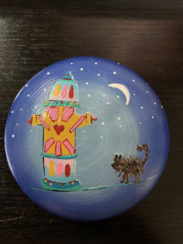 Hand-painted fire hydrant abstract (scruffy), acrylic on hand-made rock, 4″ x 1.5″.