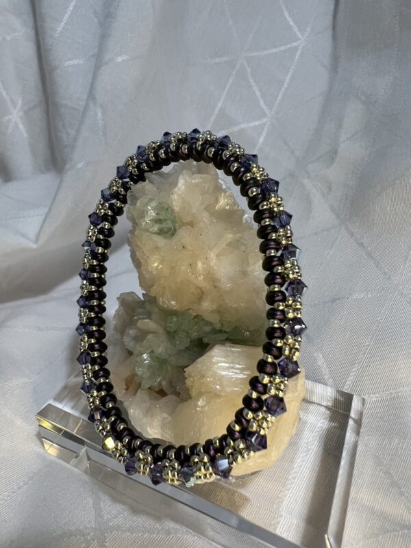 Purple crystals with silver seed beads & mini purple 2 hole beads on the bottom.