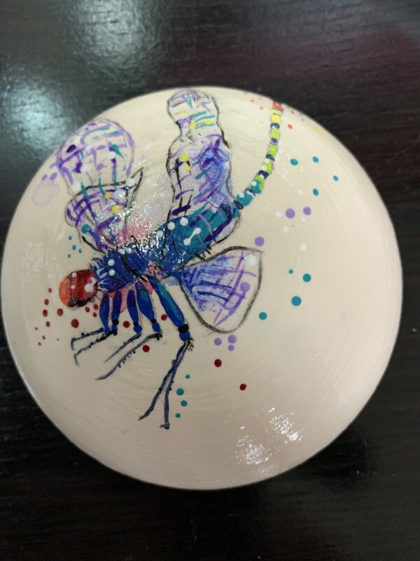 Hand-painted dragonfly, acrylic on hand-made rock, 4″ x 1.5″.