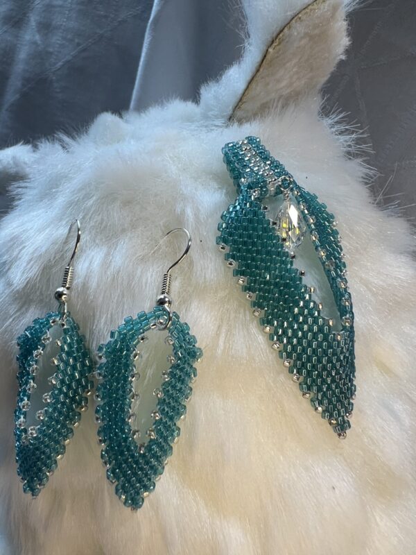 Turquoise delica seed beads, with clear crystal in the center of the pendant, leaf style.